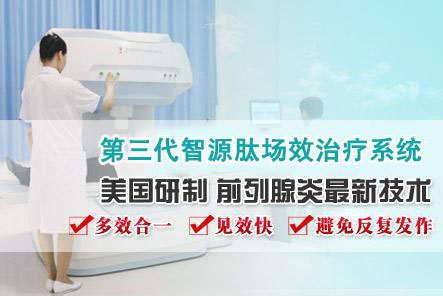 “第三代智源肽场效治疗系统”腔内场效消融系统利用高频高能聚焦电流场产生的能量,促使组织细胞内离子移动,产生生物效应,对前列腺炎有直达病灶,高效杀菌,畅通腺管,排除毒素,促进腺体功能恢复,达到消炎止痛,组织再生修复的效果。它是目前治疗各种细菌性前列腺炎,以及细菌性前列腺炎合并支原体、衣原体、淋菌性尿道炎等尿道感染理想的治疗方法。