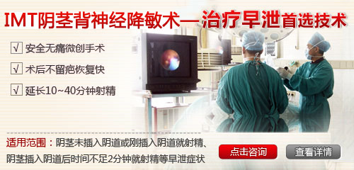 IMT阴茎背神经降敏术是利用医学高倍显微镜技术,将手术部位放大100倍以上,医生通过电子屏幕,能更科学、精细化的判断患者生殖器神经分支的分布和敏感度情况,然后选择性的对敏感的阴茎背神经进行阻滞微控,降低生殖器敏感度,达到治疗早泄的目的。与传统背神经阻断术相比具有更安全、更精细化、更高效的特点,临床治疗率已高达98.7%,被医学专家称之为泌尿外科的超微创手术。